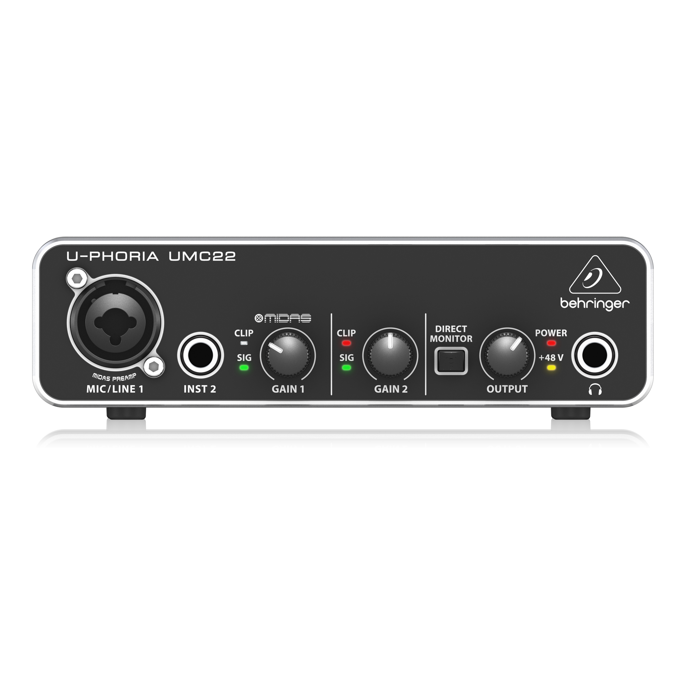 The Behringer U-Phoria UMC22 is a 2×2 USB Audio Interface, with a professional-grade MIDAS microphone preamp.