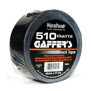 Nashua 510 Gaffer tape with black matte finish, suitable for use on Photographic, Stage & Film sets that require no light reflection. Ideally suited for temporary outdoor repairs because of its water & UV resistant construction. Colour: Black. Size available: 50mm x 27.5m